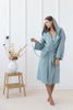 The female model in the pictures is wearing a "One size" robe in Greyish Mint color.